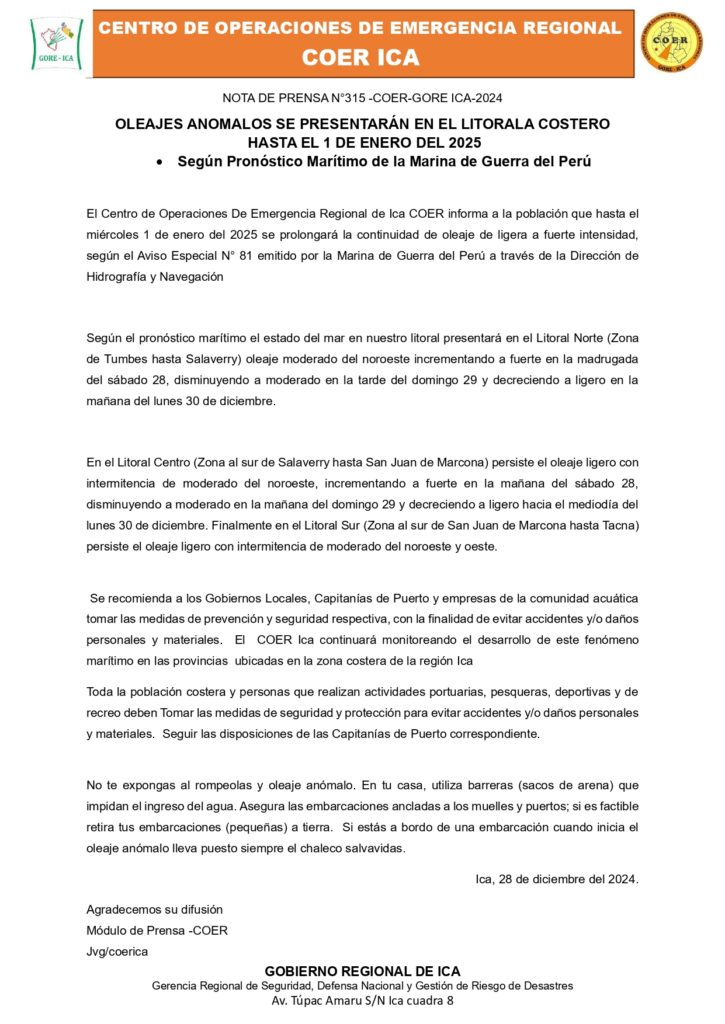 El Centro de Operaciones De Emergencia Regional de Ica – COER- informa a la población que hasta el miércoles 1 de enero del 2025 se prolongará la continuidad de oleaje de ligera a fuerte intensidad, según el Aviso Especial N° 81 emitido por la Marina de Guerra del Perú a través de la Dirección de Hidrografía y Navegación.